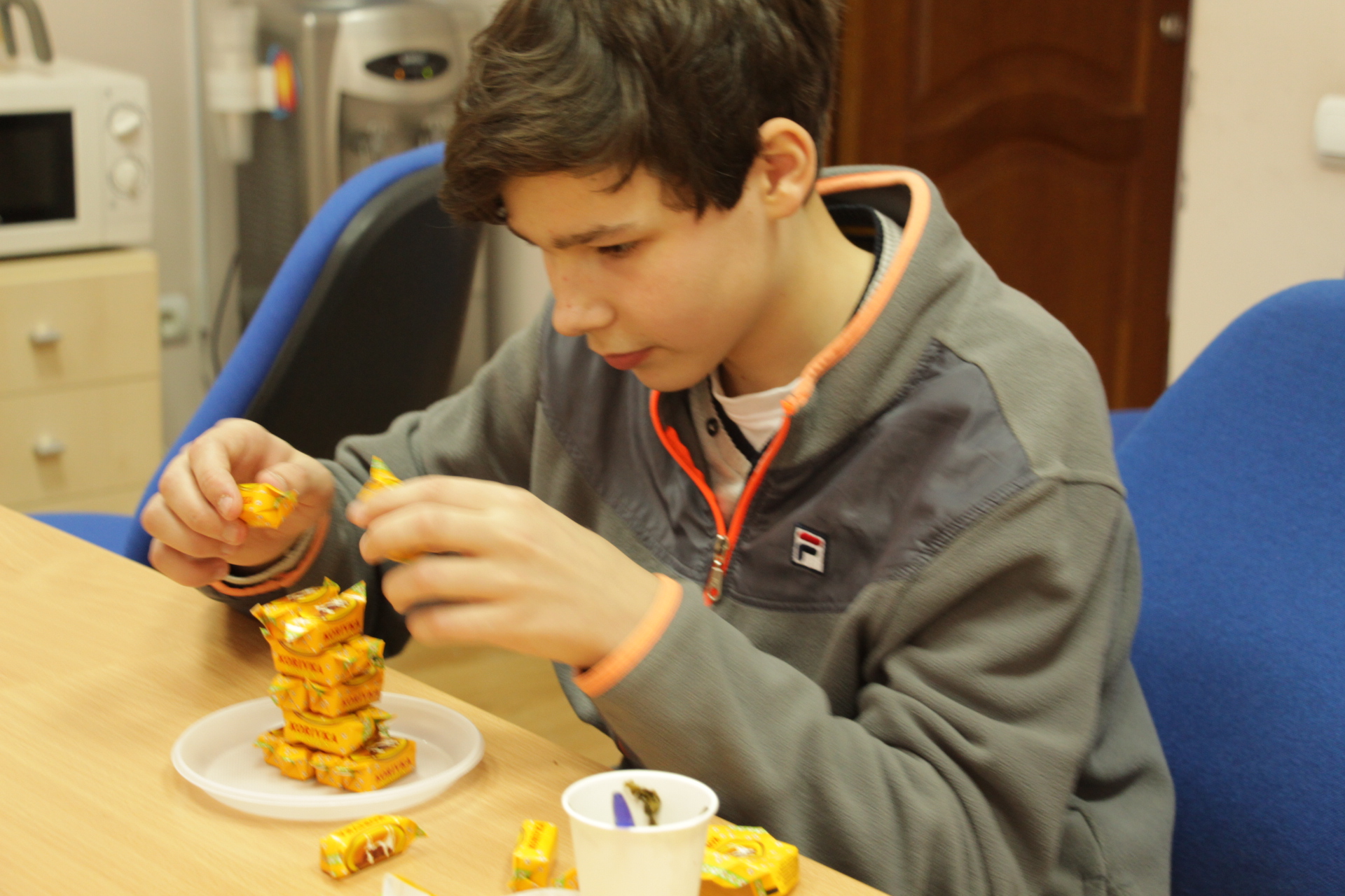After the candies they took upon plastic cups, pizza boxes and everything at hand. Young architects enjoyed it so much that they even made a small competition with each other: whose tower will be higher.
