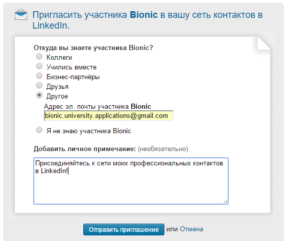 Якщо виникнуть будь-які труднощі з додаванням сторінки в свою мережу контактів, завжди можна скористатися опцією «інше» і ввести адресу електронної пошти bionic.university.applications@gmail.com (див. скріншот)