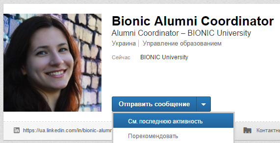 Для цього ми створили спеціальну сторінку у LinkedIn - Bionic Alumni Coordinator. Аккаунт створений для зв'язку виключно з випускниками проектів BIONIC. Тут ми повідомляємо про ексклюзивні вакансії і кар'єрні можливості компаній-партнерів, з якими вони звернулися до нас безпосередньо, а також публікуємо наші власні запрошення до співпраці - в якості експертів, спікерів, тренерів, тім-лідів. Все це ти будеш бачити в стрічці оновлень сторінки.